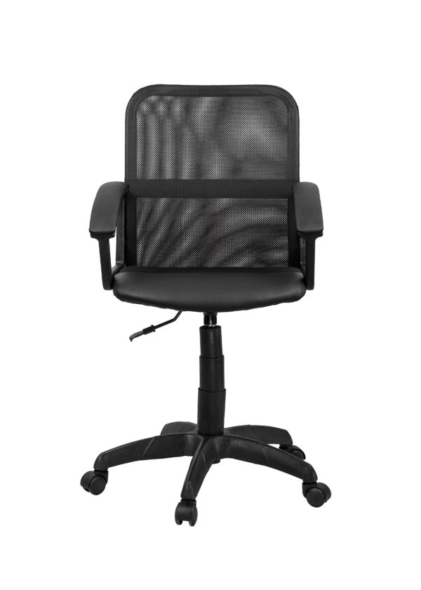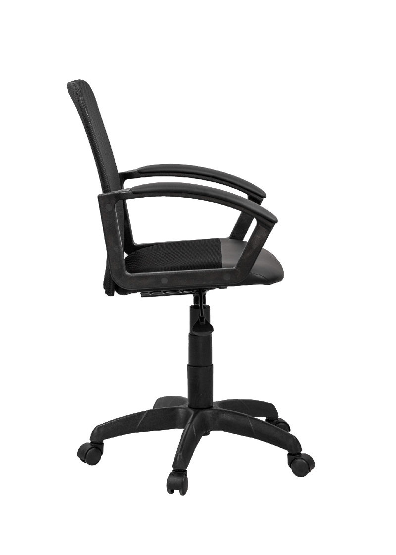 Солидное офисное кресло с регулировкой высоты. Сплошная спинка выполнена из прочной сетки. Подлокотники и пятилучие выполнены из качественного пластика.